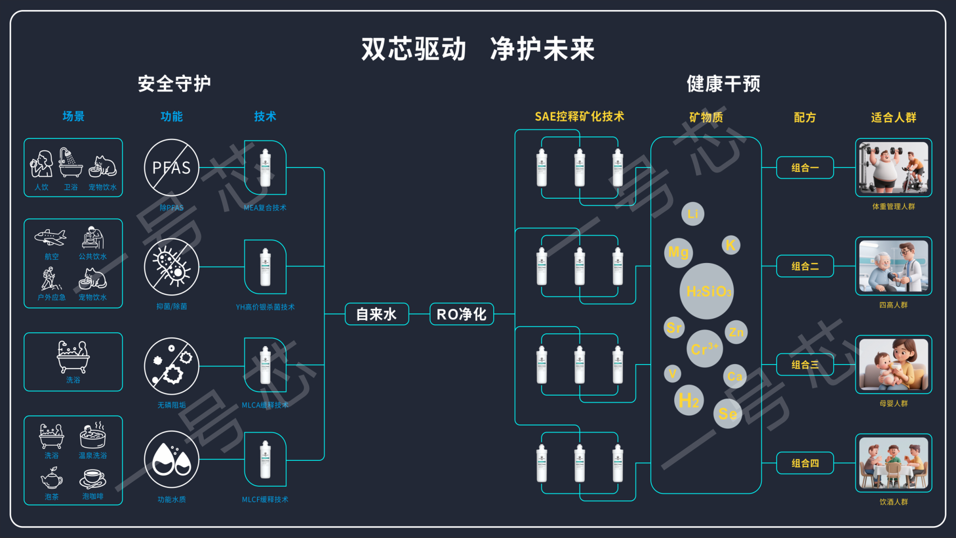 “雙芯驅動”是一号芯兩大技術戰略核心。一是進行安全守護,緻力於(yú)去除水中的有害物質,並(bìng)添加功能成分,全方位守護人們飲水與用水的安全;二是進行健康幹預,向水中精準添加有益礦物質元素,根據不同人群的健康需求,提供定制化礦物質水質,實現個性化的健康幹預。